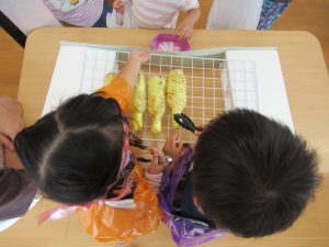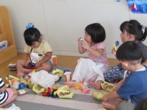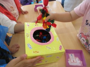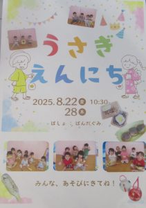 今日は「うさぎ組えんにち」 2025/08/22 今日は「うさぎ組えんにち」。 美味しそうな香りが漂いそうな 手作りの綿あめ、やきそば、たこやき、とうもろこし ぜ~んぶ食べたいなぁ~♪ ゲーム遊びも楽しかったよ。 くじ引き、ボール入れ、ヨーヨーすくい みんなと一緒にLet’s Try!!